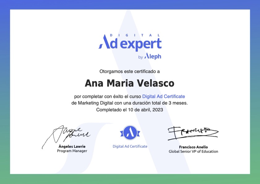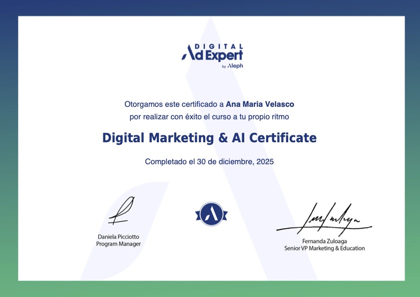 - Marketing Digital & Media Buyer (2023) • Digital Marketing con IA (2025) – Digital Ad Expert