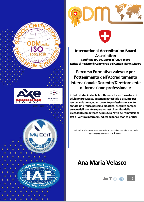 ❏ Attualmente iscritta al percorso formativo di eccellenza valevole per l’ottenimento dell’accreditamento internazionale Docente/direttore ente di formazione professionale livello crediti formativi IQF 5, IQF 6