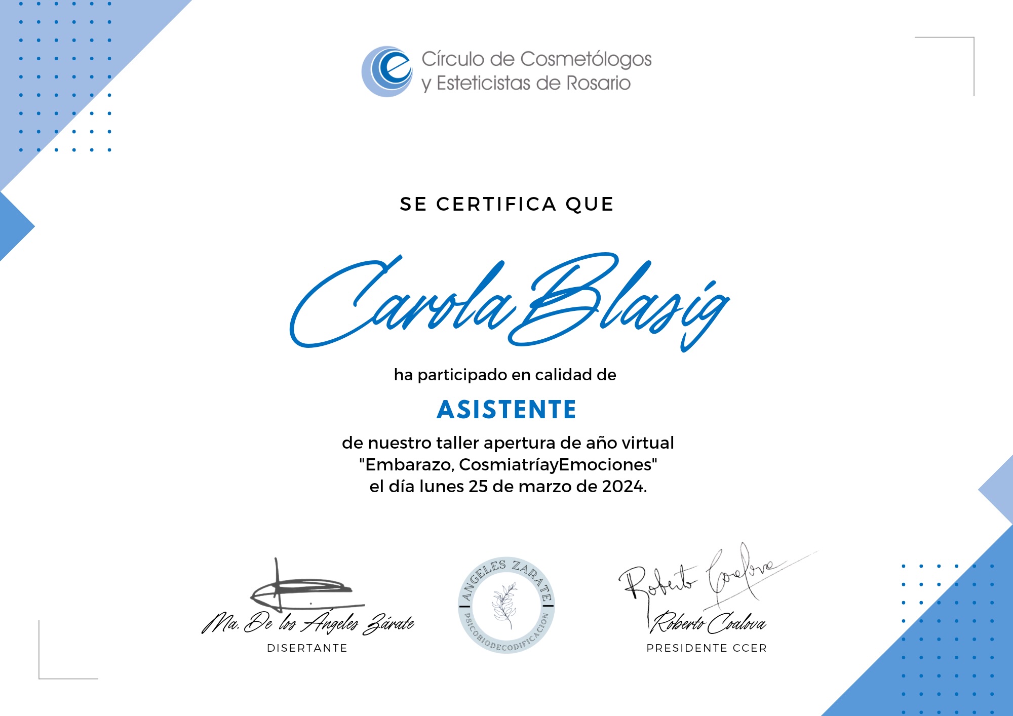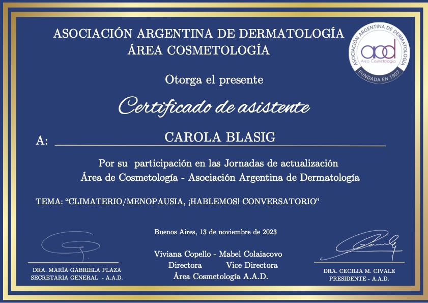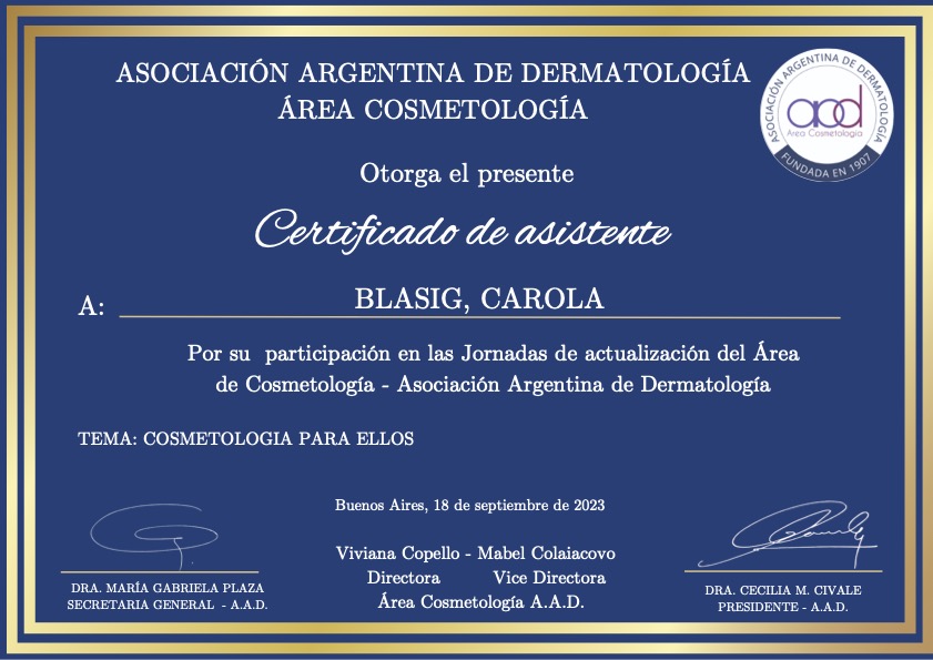 - Socia aggiunta – area Cosmetologia – della Asociación Argentina de Dermatología, n. A 3018.