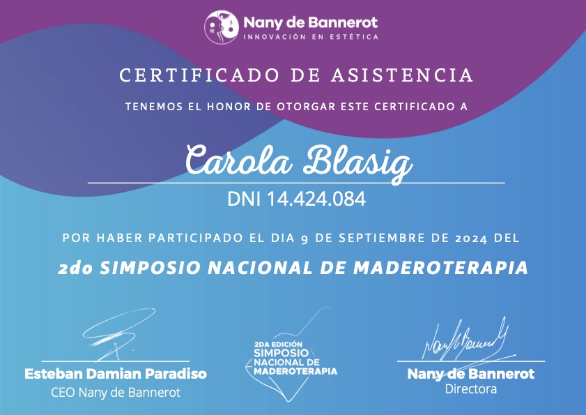 - Cosmetologa diplomata presso la Escuela Artez Westerley, Buenos Aires – Matrícula Nacional n. 2210.