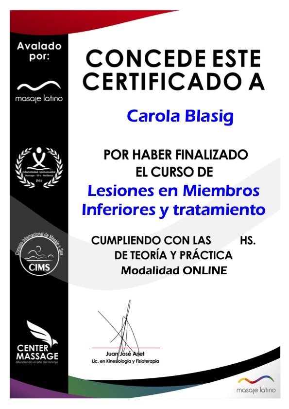 - Certificazione di “Especialista en Estética Oncológica y Paliativa” – agosto 2024, AADEO.