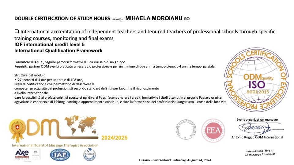È stato pertanto rilasciato l’accreditamento internazionale di terapista nel settore medicina complementare ed alternativa, con attribuzione livello crediti formativi IQF 2 e l’accreditamento internazionale docente/Direttore ente di formazione professionalelivello crediti formativi IQF 5, IQF 6 (International Qualifications Framework).