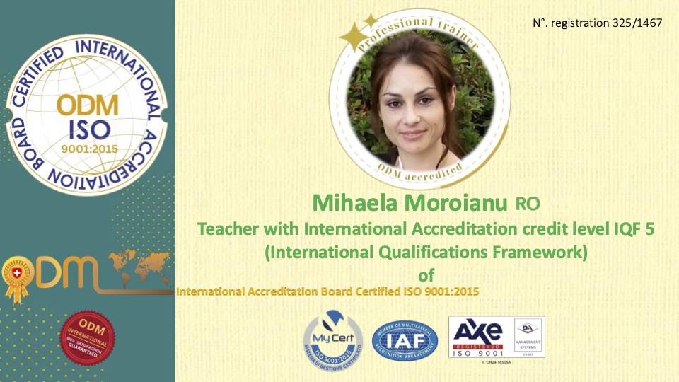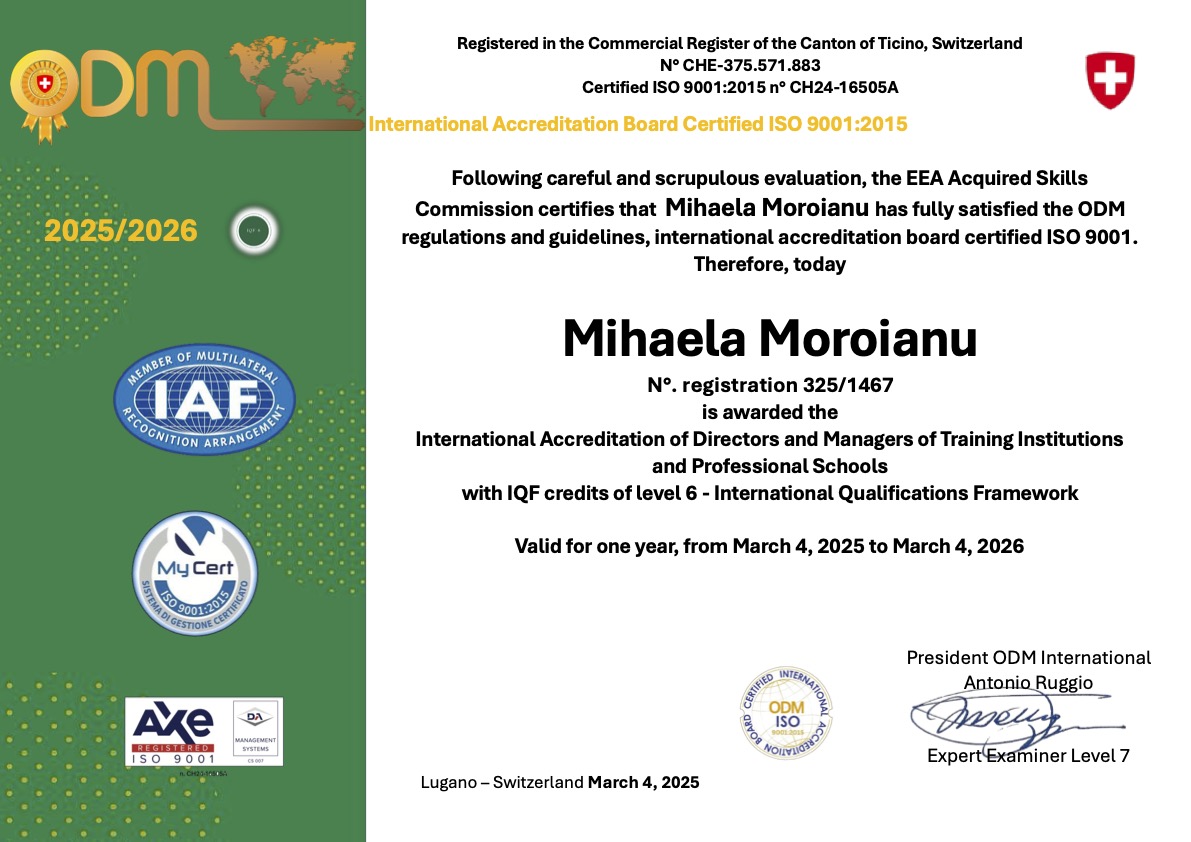 La Commissione di Valutazione delle Esperienze Acquisite (EEA) si congratula con la collega Mihaela Moroianu 🇷🇴 per aver superato con successo il test di verifica delle competenze acquisite, soddisfacendo pienamente tutte le normative internazionali e le linee guida dell’ODM International Accreditation Board, certificato ISO 9001:2015.