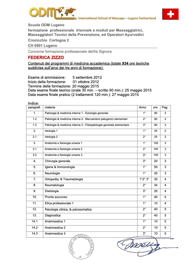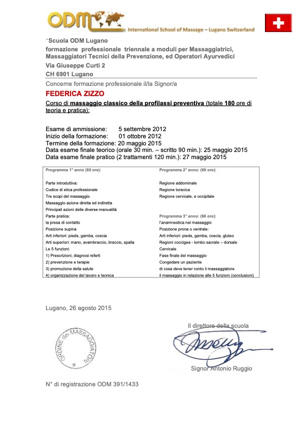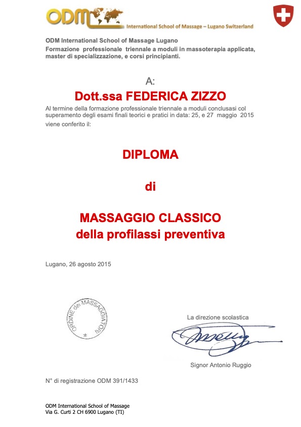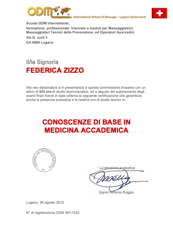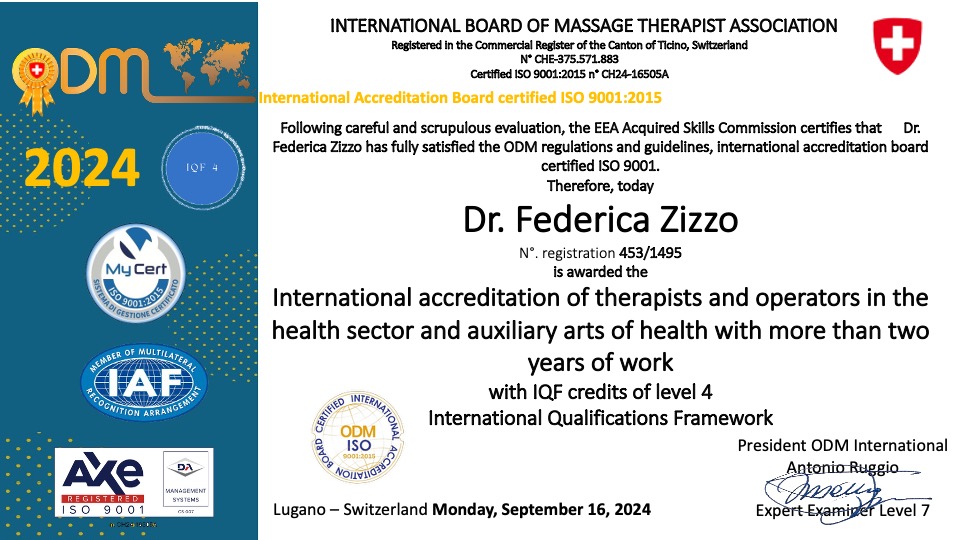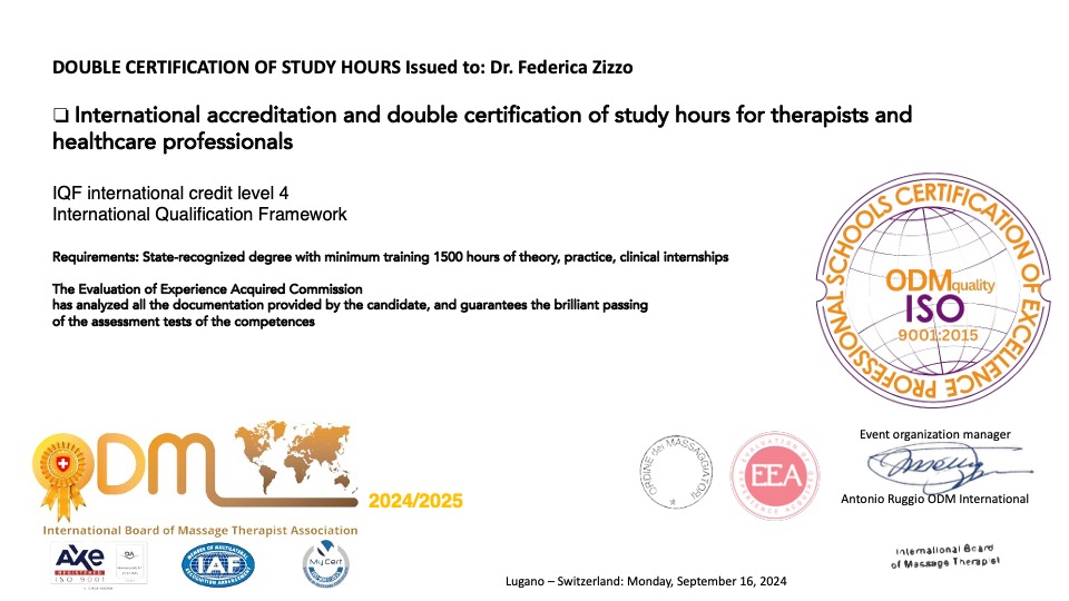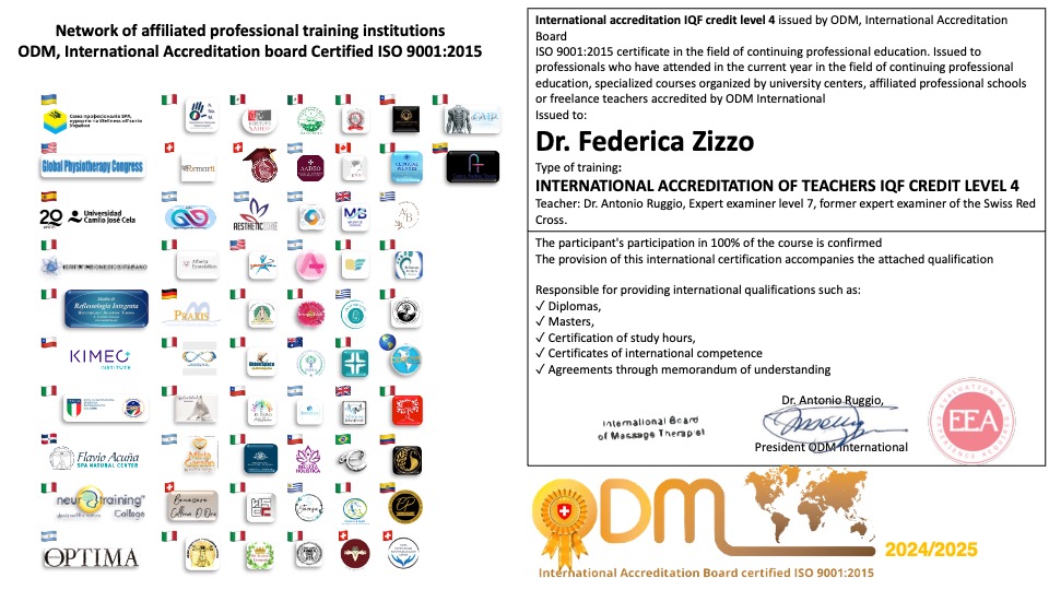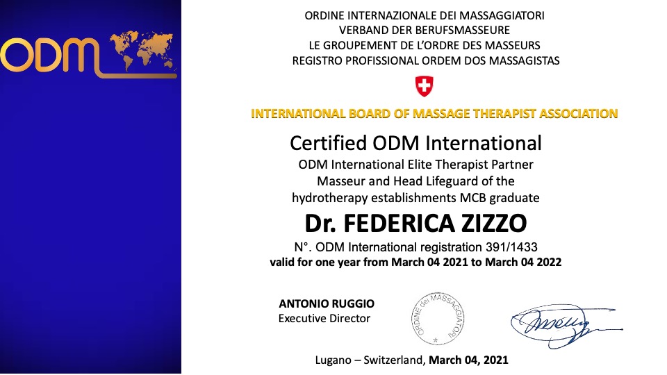 Ringrazio l’Associazione ODM e soprattutto il preciso e serio lavoro del suo Presidente Dr. Antonio Ruggio che permette a terapisti come me di arricchirsi nel costante aggiornamento e formazione nel settore del benessere e della salute. Riuscendo ad acquisire sempre nell’ambito della Formazione Professionale continua l’accreditamento internazionale รlite Therapist Partner livello crediti formativi IQF 4