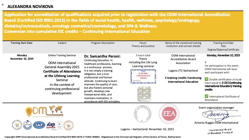 Erogati da: ODM International Accreditation Board Certified ISO 9001:2015 n° CH24-16505A nell’ambito della formazione professionale continua
