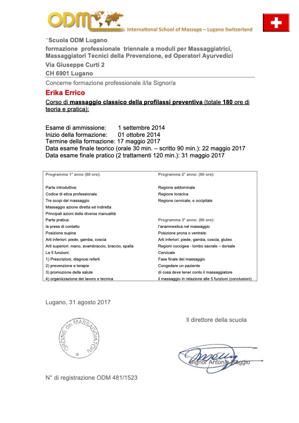Ho praticato massaggi su schiena, arti, viso e testa, imparando il massaggio base e lo psicoemoriflesso. In seguito mi sono dedicata alla riflessologia plantare e allo studio dei cinque elementi (fuoco, terra, aria, acqua, legno).