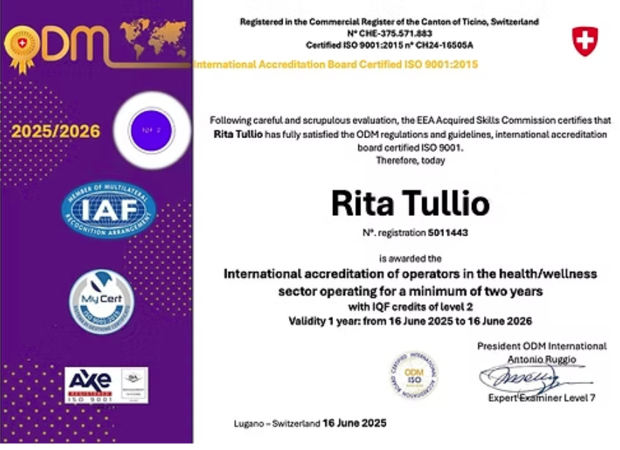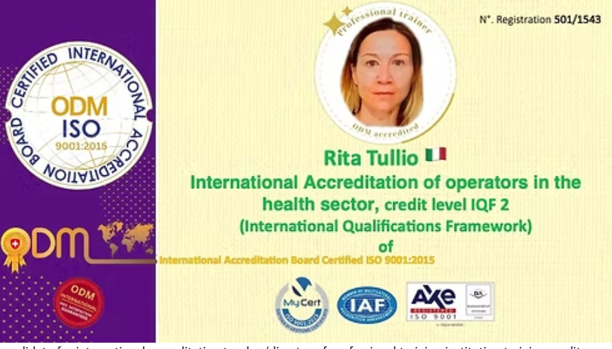 Γ stato pertanto rilasciato lβaccreditamento internazionale di terapista nel settore sociosanitario, con attribuzione diΒ crediti formativi livello IQF 4 (International Qualifications Framework).