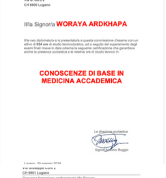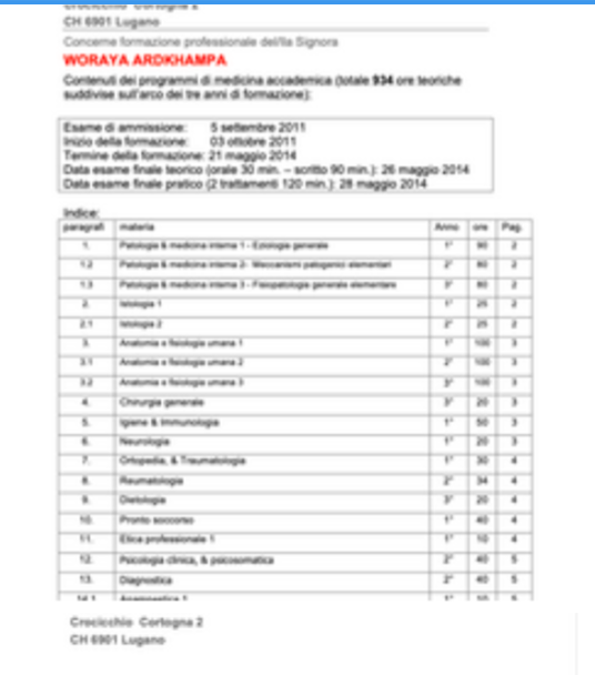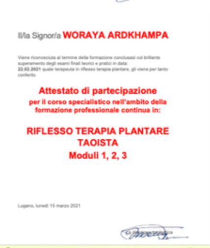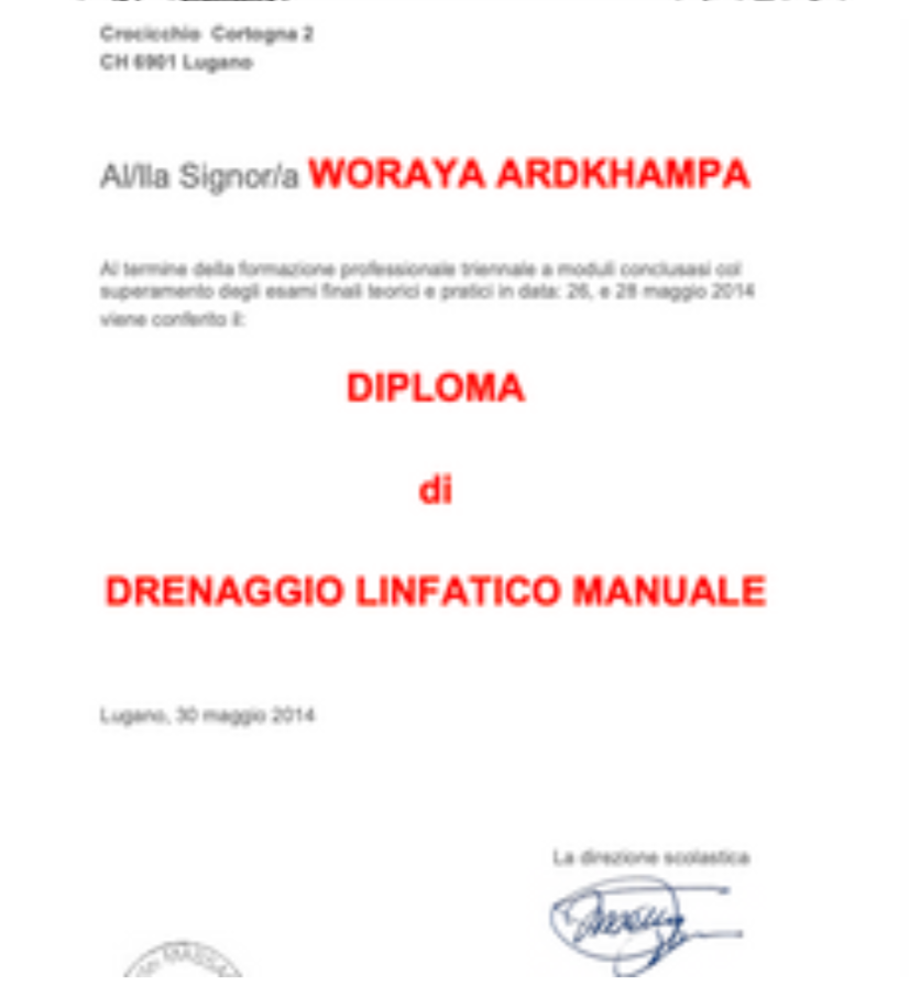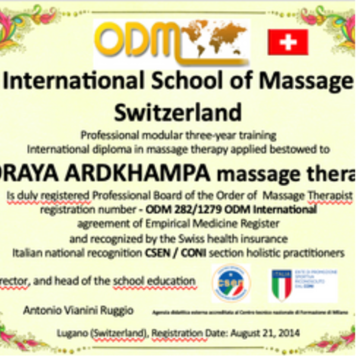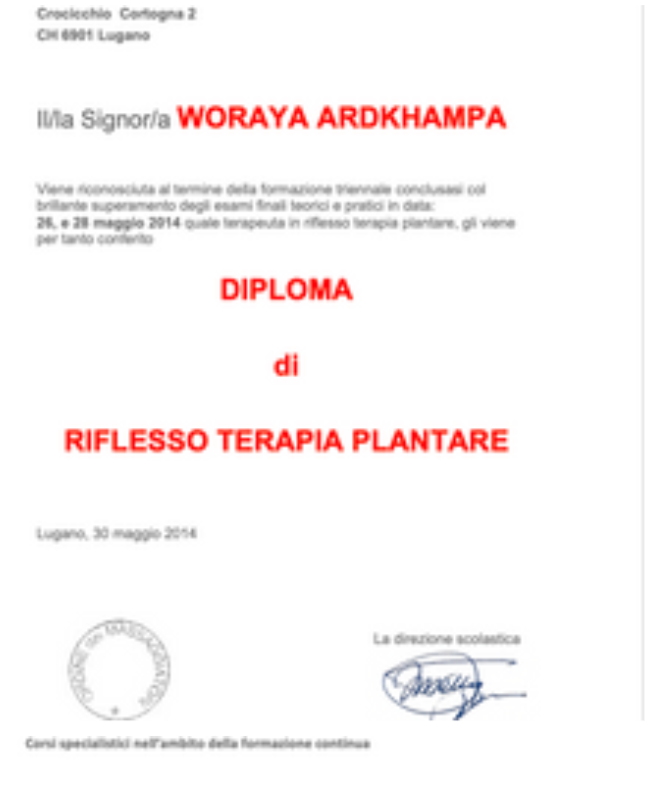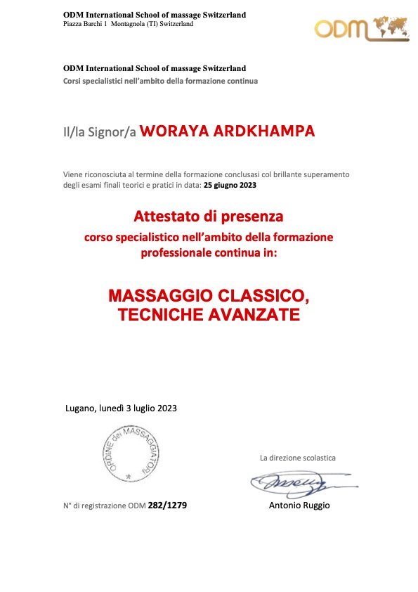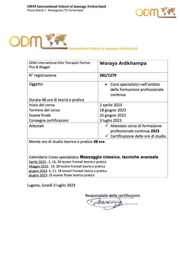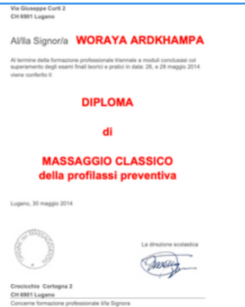 - Massoterapista, Diploma triennale in massoterapia applicata conseguito presso la ODM International School of Massage Switzerland