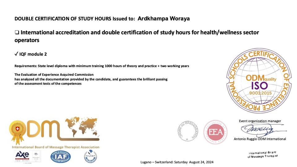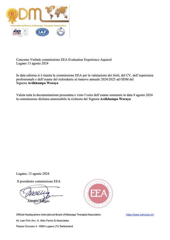 La Commissione di Valutazione delle Esperienze Acquisite (EEA) si congratula con la collega Woraya Ardkhampa 🇹🇭 per aver superato con successo il test di verifica delle competenze acquisite, soddisfacendo pienamente tutte le normative internazionali e le linee guida dell’ODM International Accreditation Board, certificato ISO 9001:2015.